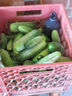 | Here is a small picking of cucumbers... I am up to my ears with cucumbers!! I have already canned 22 pints of sweet pickles, 8 quarts of dill pickles, and I have another batch of about 15 pints of sweet pickles in the making!! Not to mention the about 35 lbs of cukes I've given to my Mom to pickle! Not pictured are all of the green beans, potatoes, and jalapenos we've been enjoying :) We got a few squash and zucchini's, but the plants died due to ANTS burrowing in the roots :( |